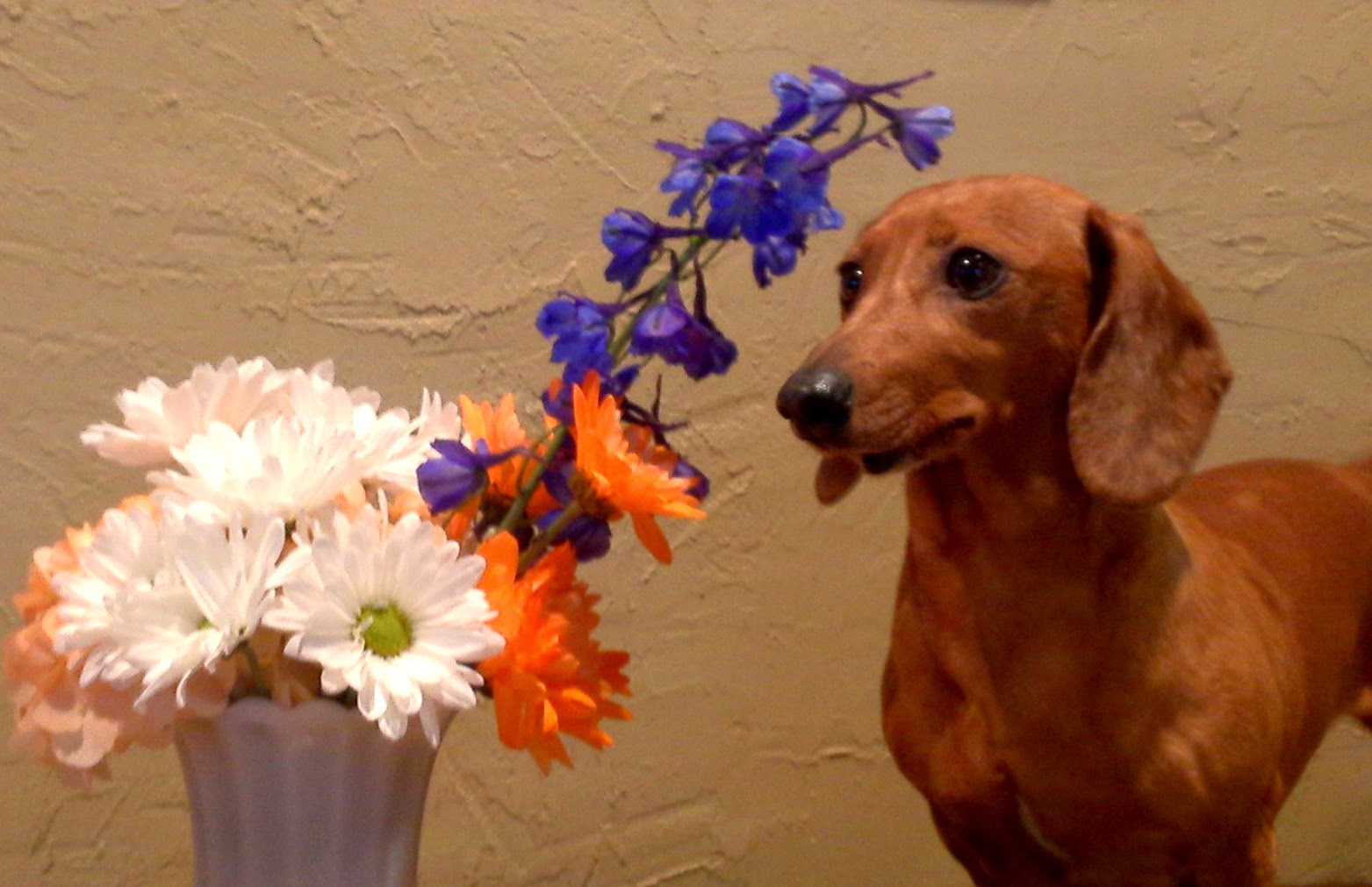 Here is my sweet Sophie.....exactly where she does not belong. On The Table. But I snapped a picture of her anyway...she just wanted to smell the flowers!
